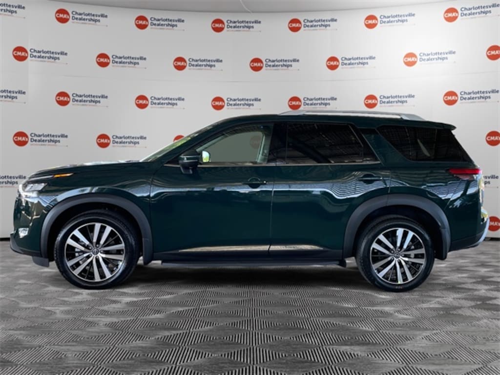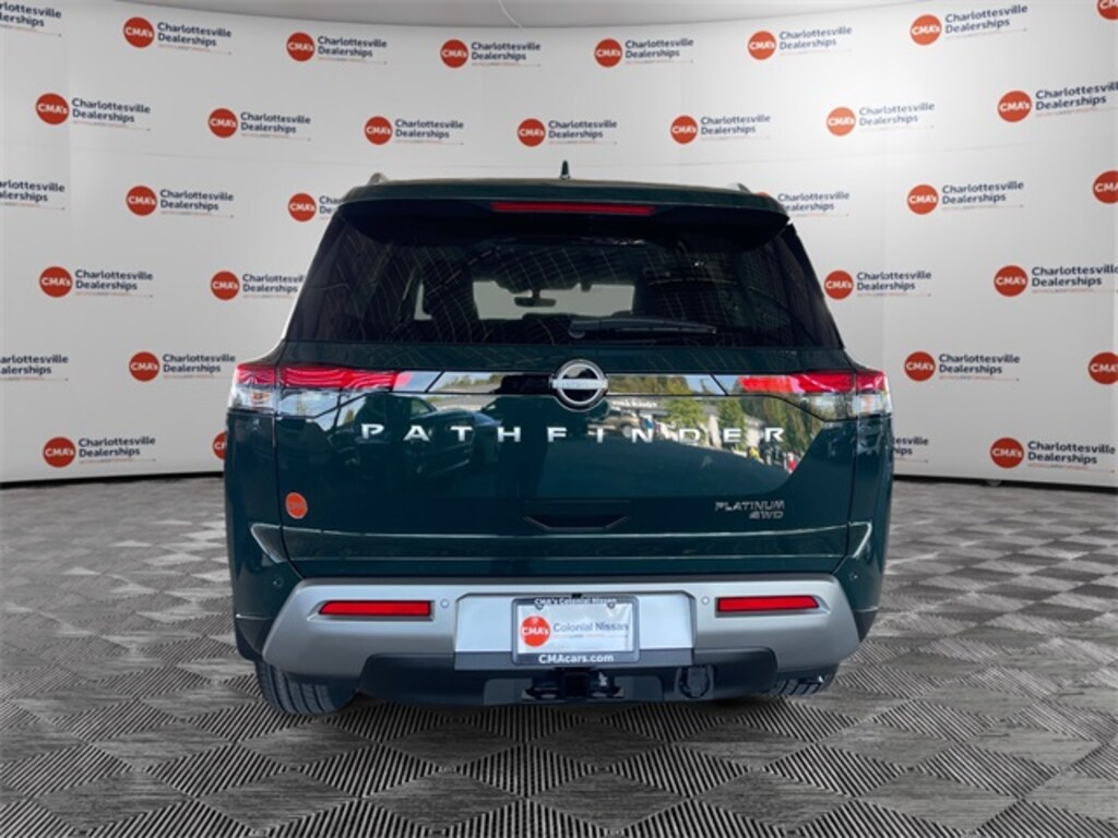 Obsidian Green Pearl 2025 Nissan Pathfinder Platinum 4WD 9-Speed Automatic 3.5L V6 DOHC 4WD, 13 Speakers, 3rd row seats: bench, 4-Wheel Disc Brakes, ABS brakes, Air Conditioning, Alloy wheels, AM/FM radio: SiriusXM, Auto High-beam Headlights, Auto tilt-away steering wheel, Auto-dimming Rear-View mirror, Automatic temperature control, Bench Seat Carpeted Floor Mats (Set of 4), Bodyside moldings, Bose Premium Audio System, Brake assist, Bumpers: body-color, Cargo Area Protector, Cargo Net, Cargo Package, Climate Controlled Front Bucket Seats, Dash Cam - Dual Camera Drive Recorder, Delay-off headlights, Driver door bin, Driver vanity mirror, Dual front impact airbags, Dual front side impact airbags, Electronic Stability Control, Emergency communication system, Exterior Parking Camera Rear, First Aid, Four wheel independent suspension, Front anti-roll bar, Front Bucket Seats, Front Center Armrest, Front dual zone A/C, Front reading lights, Fully automatic headlights, Garage door transmitter: HomeLink, Heads-Up Display, Heated door mirrors, Heated front seats, Heated rear seats, Heated steering wheel, Illuminated entry, Knee airbag, Leather steering wheel, LED Fog Lamps, Low tire pressure warning, Memory seat, Navigation system: NissanConnect with Navigation and Services, Nissan USB Charging Cable Set, NissanConnect featuring Apple CarPlay and Android Auto, NissanConnect w/Navigation & Services, Occupant sensing airbag, Outside temperature display, Overhead airbag, Overhead console, Panic alarm, Passenger door bin, Passenger vanity mirror, Power door mirrors, Power driver seat, Power Liftgate, Power moonroof, Power passenger seat, Power steering, Power windows, Radio data system, Radio: AM/FM Audio System, Rain sensing wipers, Rear air conditioning, Rear anti-roll bar, Rear reading lights, Rear seat center armrest, Rear side impact airbag, Rear window defroster, Rear window wiper, Reclining 3rd row seat, Remote keyless entry, Running Boards, Security system, Semi-Aniline Leather-Appointed Seating Surfaces, Speed control, Speed-sensing steering, Speed-Sensitive Wipers, Split folding rear seat, Spoiler, Steering wheel memory, Steering wheel mounted audio controls, Tachometer, Telescoping steering wheel, Tilt steering wheel, Traction control, Trip computer, Turn signal indicator mirrors, Variably intermittent wipers, Ventilated front seats, Wheels: 20" x 8J Machined Alloy, 4WD.