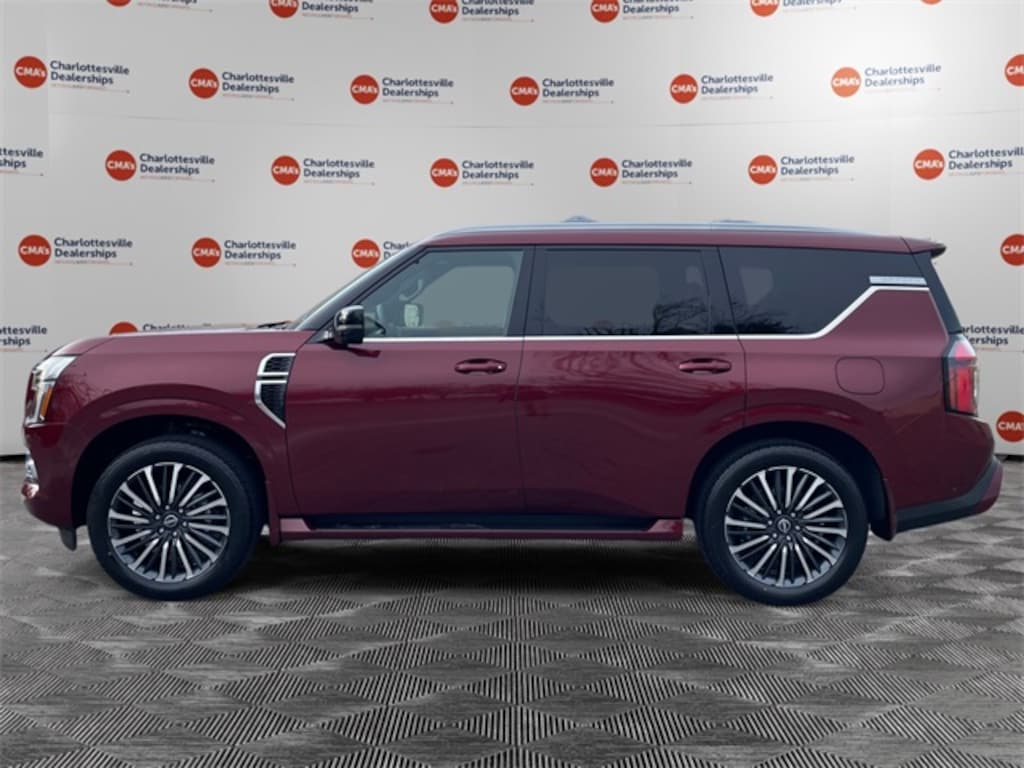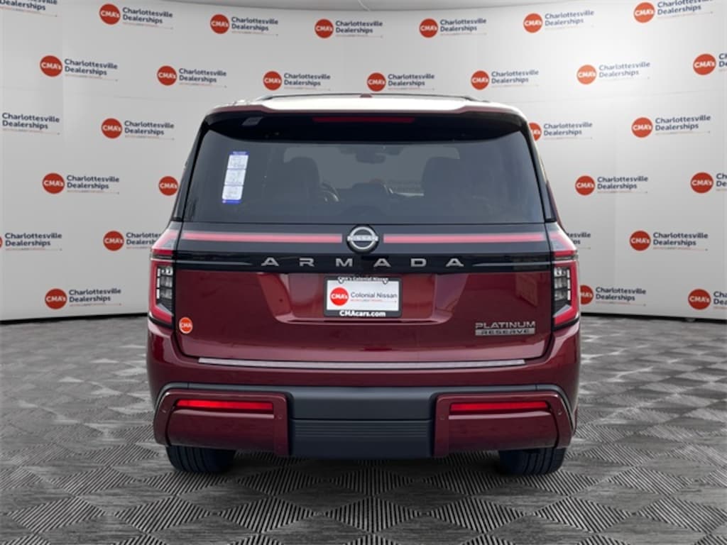 Coulis Red Pearl 2026 Nissan Armada Platinum Reserve 4WD 9-Speed Automatic 3.5L DOHC 4WD, 12 Speakers, 2nd-Row Split Bench Seat w/40/20/40-Split Folding, 3rd row seats: split-bench, 4-Wheel Disc Brakes, ABS brakes, Adaptive suspension, Air Conditioning, Alloy wheels, AM/FM radio: SiriusXM w/360L, Anti-whiplash front head restraints, Apple CarPlay/Android Auto, Auto High-beam Headlights, Auto tilt-away steering wheel, Auto-dimming door mirrors, Auto-dimming Rear-View mirror, Auto-leveling suspension, Automatic temperature control, Brake assist, Bumpers: body-color, Carpeted Floor Mats with Bench Seat, Center Armrest with Two Cupholders, Climate Controlled Heated and Ventilated Front Seats, Compass, Cross Bars, Delay-off headlights, Driver door bin, Driver vanity mirror, Dual front impact airbags, Dual front side impact airbags, Electronic Stability Control, Emergency communication system: NissanConnect Services, EZ Flex Second Row Seating System with One Touch Release, Four wheel independent suspension, Front anti-roll bar, Front Bucket Seats, Front Center Armrest, Front dual zone A/C, Front fog lights, Front reading lights, Fully automatic headlights, Garage door transmitter: HomeLink, Genuine wood dashboard insert, Heads-Up Display, Heated door mirrors, Heated front seats, Heated rear seats, Heated steering wheel, HVAC memory, Illuminated entry, Illuminated Kick Plates, Knee airbag, Leather steering wheel, Low tire pressure warning, Memory seat, Navigation system: Google Maps, Occupant sensing airbag, Outside temperature display, Overhead airbag, Overhead console, Panic alarm, Passenger door bin, Passenger vanity mirror, Power door mirrors, Power driver seat, Power Liftgate, Power moonroof, Power passenger seat, Power steering, Power windows, Premium Paint, Quilted Leather Seat Trim, Radio: NissanConnect with SiriusXM 360L, Rain sensing wipers, Rear air conditioning, Rear anti-roll bar, Rear Bumper Protector, Rear reading lights, Rear window defroster, Rear window wiper, Reclining 3rd row seat, Remote keyless entry, Security system, Speed control, Speed-sensing steering, Speed-Sensitive Wipers, Splash Guards, Split Bench Seat Package, Split folding rear seat, Spoiler, Steering wheel memory, Steering wheel mounted audio controls, Tachometer, Telescoping steering wheel, Tilt steering wheel, Traction control, Trip computer, Turn signal indicator mirrors, Variably intermittent wipers, Ventilated front seats, Voltmeter, Wheels: 22" x 8.5J Machined & Painted Alloy, 4WD.