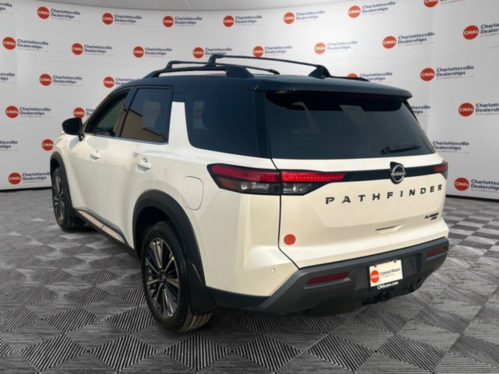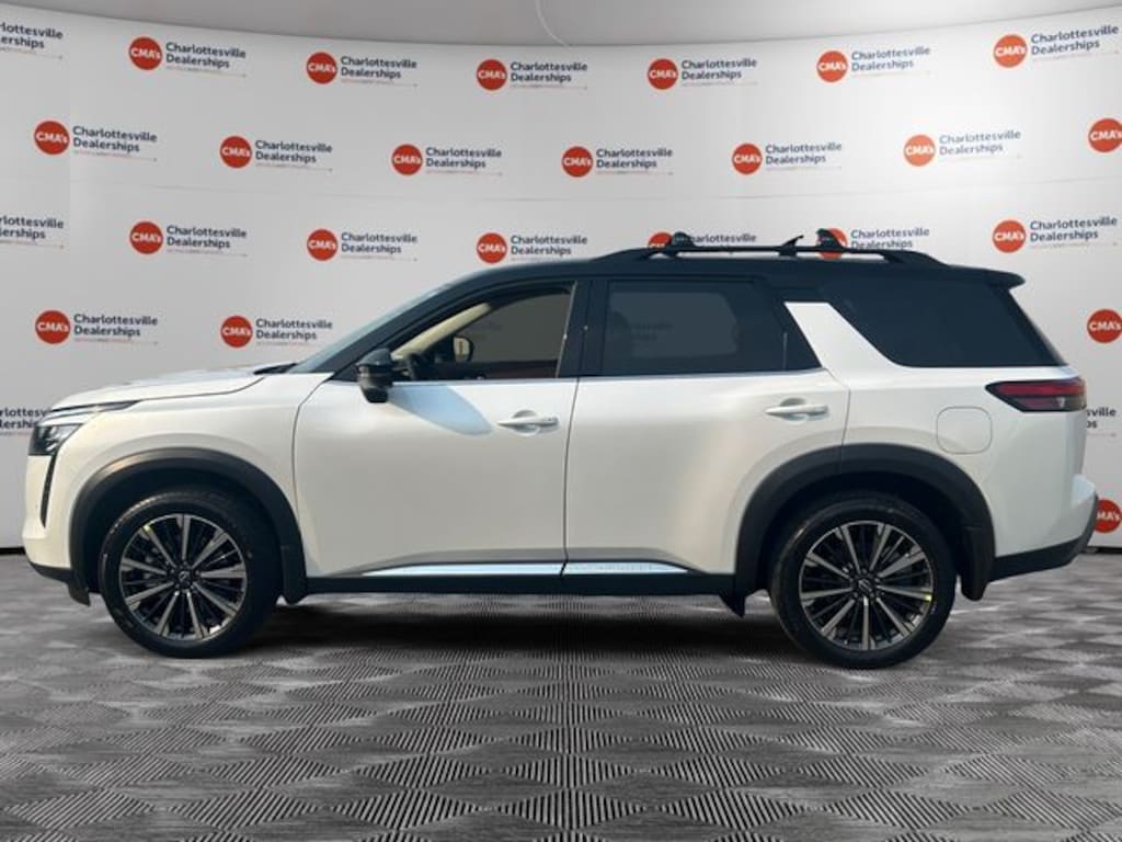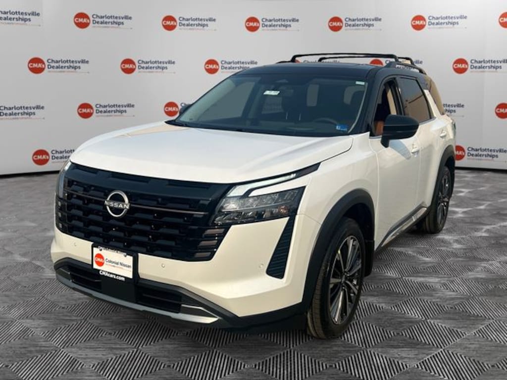 Everest White Pearl/Black 2026 Nissan Pathfinder Platinum 4WD 9-Speed Automatic 3.5L V6 DOHC 4WD, 13 Speakers, 2nd-Row Captain Chairs, 2nd-Row Removable Centre Console, 3rd row seats: bench, 4-Piece Black Splash Guards, 4-Wheel Disc Brakes, ABS brakes, Air Conditioning, Alloy wheels, AM/FM radio: SiriusXM w/360L, Auto High-beam Headlights, Auto tilt-away steering wheel, Auto-dimming Rear-View mirror, Automatic temperature control, Bodyside moldings, Bose Premium Audio System, Brake assist, Bumpers: body-color, Captain's Chairs Carpeted Floor Mats, Cargo Area Protector, Cargo Net, Cargo Package, Climate Controlled Front Bucket Seats, Cross Bars, Delay-off headlights, Driver door bin, Driver vanity mirror, Dual front impact airbags, Dual front side impact airbags, Electronic Stability Control, Emergency communication system: NissanConnect Services, First Aid, Four wheel independent suspension, Front anti-roll bar, Front Bucket Seats, Front Center Armrest, Front dual zone A/C, Front reading lights, Fully automatic headlights, Garage door transmitter: HomeLink, Heads-Up Display, Heated door mirrors, Heated front seats, Heated rear seats, Heated steering wheel, Illuminated entry, Knee airbag, Low tire pressure warning, Memory seat, Nissan USB Charging Cable Set, NissanConnect featuring Apple CarPlay and Android Auto, Occupant sensing airbag, Outside temperature display, Overhead airbag, Overhead console, Panic alarm, Passenger door bin, Passenger vanity mirror, Platinum Captain Chairs Package, Power door mirrors, Power driver seat, Power Liftgate, Power moonroof, Power passenger seat, Power steering, Power windows, Premium Paint and 2-Tone Roof, Radio data system, Radio: AM/FM Audio System with NissanConnect, Rain sensing wipers, Rear air conditioning, Rear anti-roll bar, Rear reading lights, Rear seat center armrest, Rear side impact airbag, Rear window defroster, Rear window wiper, Reclining 3rd row seat, Remote keyless entry, Security system, Semi-Aniline Leather-Appointed Seating Surfaces, Speed control, Speed-sensing steering, Speed-Sensitive Wipers, Split folding rear seat, Spoiler, Steering wheel memory, Steering wheel mounted audio controls, Tachometer, Telescoping steering wheel, Tilt steering wheel, Traction control, Trip computer, Turn signal indicator mirrors, Variably intermittent wipers, Ventilated front seats, Wheels: 20" Machined Alloy, 4WD.